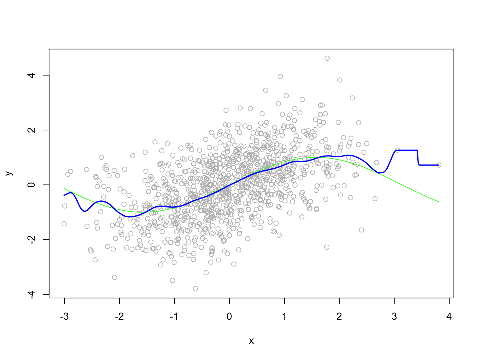 }Take \(n = 20\) and generate \(Y = \sin(X) + \exp(X/5) + \epsilon\) where \(\epsilon \sim N(0, 0.1^2)\).