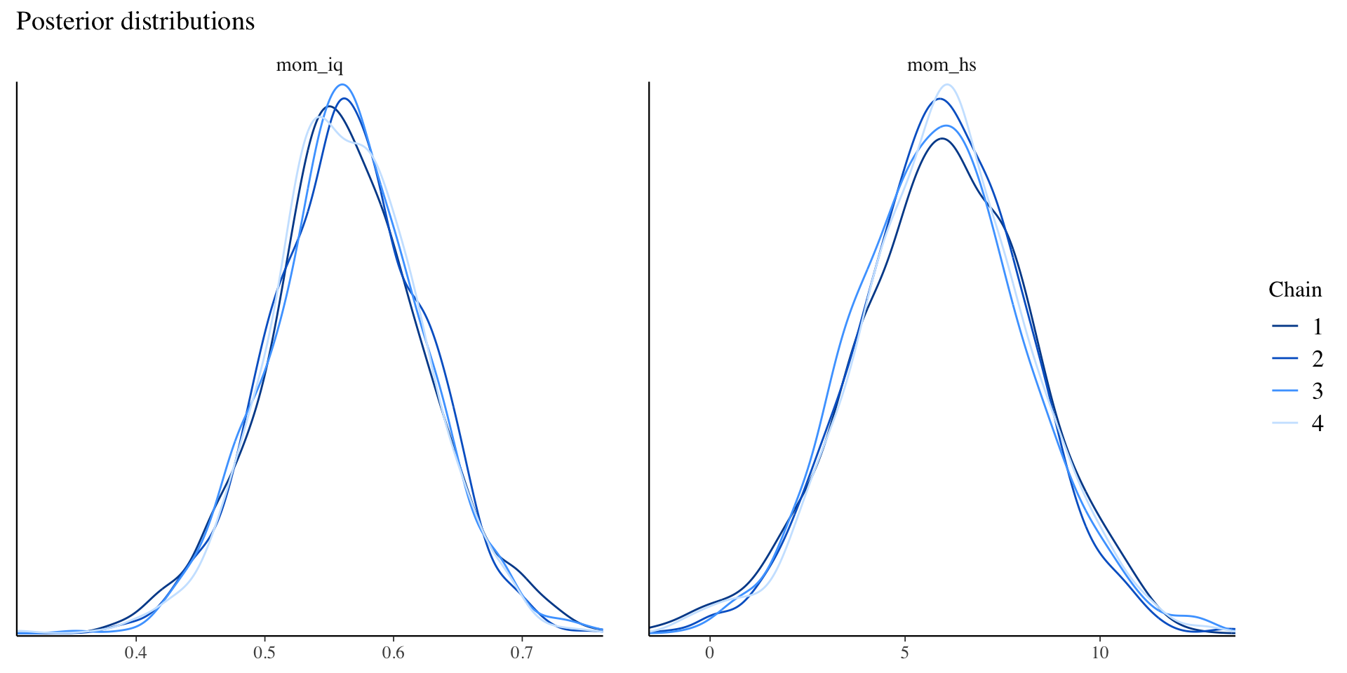 fit2 <- stan_glm(kid_score ~ mom_hs + mom_iq, data=kidiq,