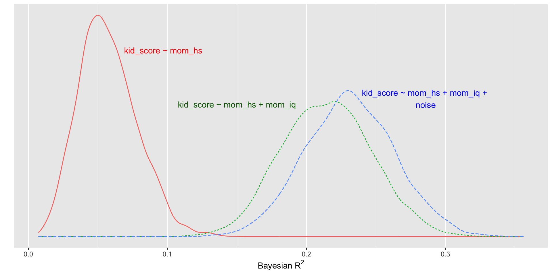 r2_fit3 <- bayes_R2(fit3)Although adding noise predictors does increase the \(R^2\), the change is negligible compared to the uncertainty of \(R^2\).