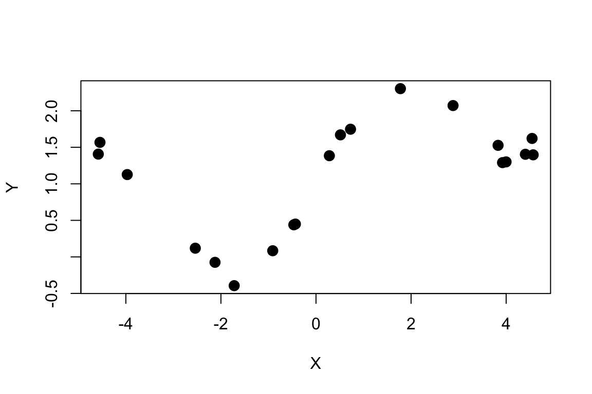 }Take \(n = 20\) and generate \(Y = \sin(X) + \exp(X/5) + \epsilon\) where \(\epsilon \sim N(0, 0.1^2)\).