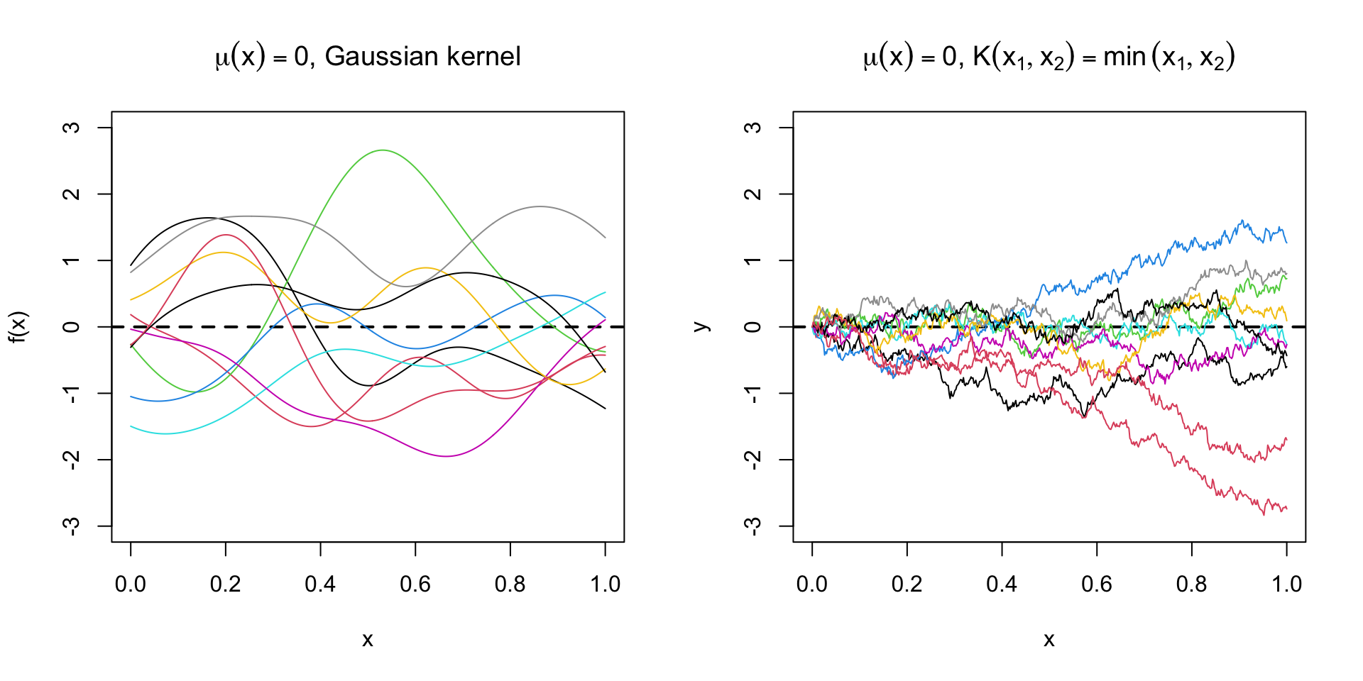 A ``random function’’ \(f\) is said to follow a Gaussian process, denoted by \[ f \sim \mc{GP}(\mu, K), \] if for any \(x_1, \ldots, x_n\), the random vector \((f(x_1), \ldots, f(x_n))\) has a multivariate normal distribution, i.e., \[ \left[\begin{array}{c} f(x_1)\\ \vdots\\ f(x_n) \end{array}\right] \sim N\left(\left[\begin{array}{c} \mu(x_1)\\ \vdots\\ \mu(x_n), \end{array}\right], \left[\begin{array}{ccc} K(x_1, x_1) & \cdots & K(x_1, x_n)\\ \vdots & \ddots & \vdots\\ K(x_n, x_1) & \cdots & K(x_n, x_n) \end{array}\right]\right). \]