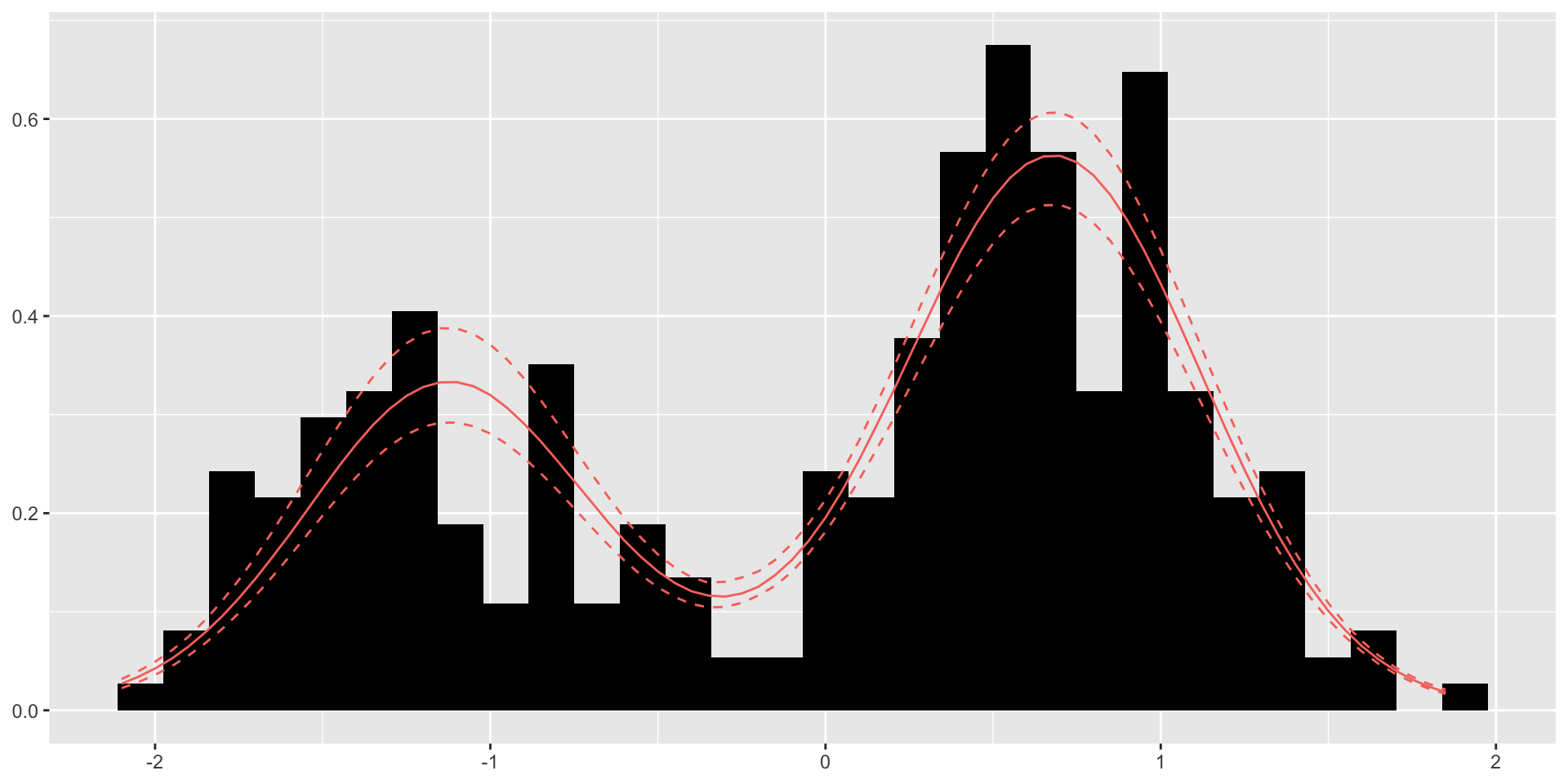 library(dirichletprocess)its <-500# Number of iterationsfaithfulTransformed <-scale(faithful$waiting)dp <-DirichletProcessGaussian(faithfulTransformed)dp <-Fit(dp, its)plot(dp, data_method="hist")