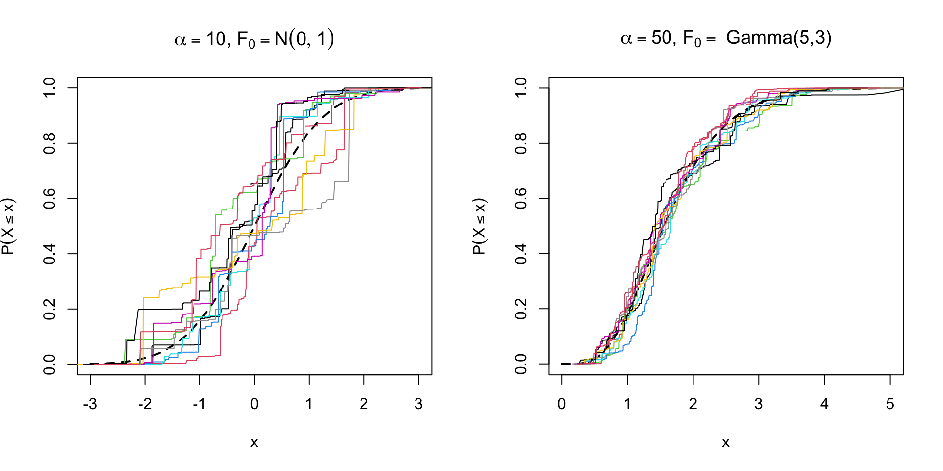 The parameter \(\alpha > 0\) is called the concentration parameter: large \(\alpha\) means \(F\) is more concentrated around \(F_0\).