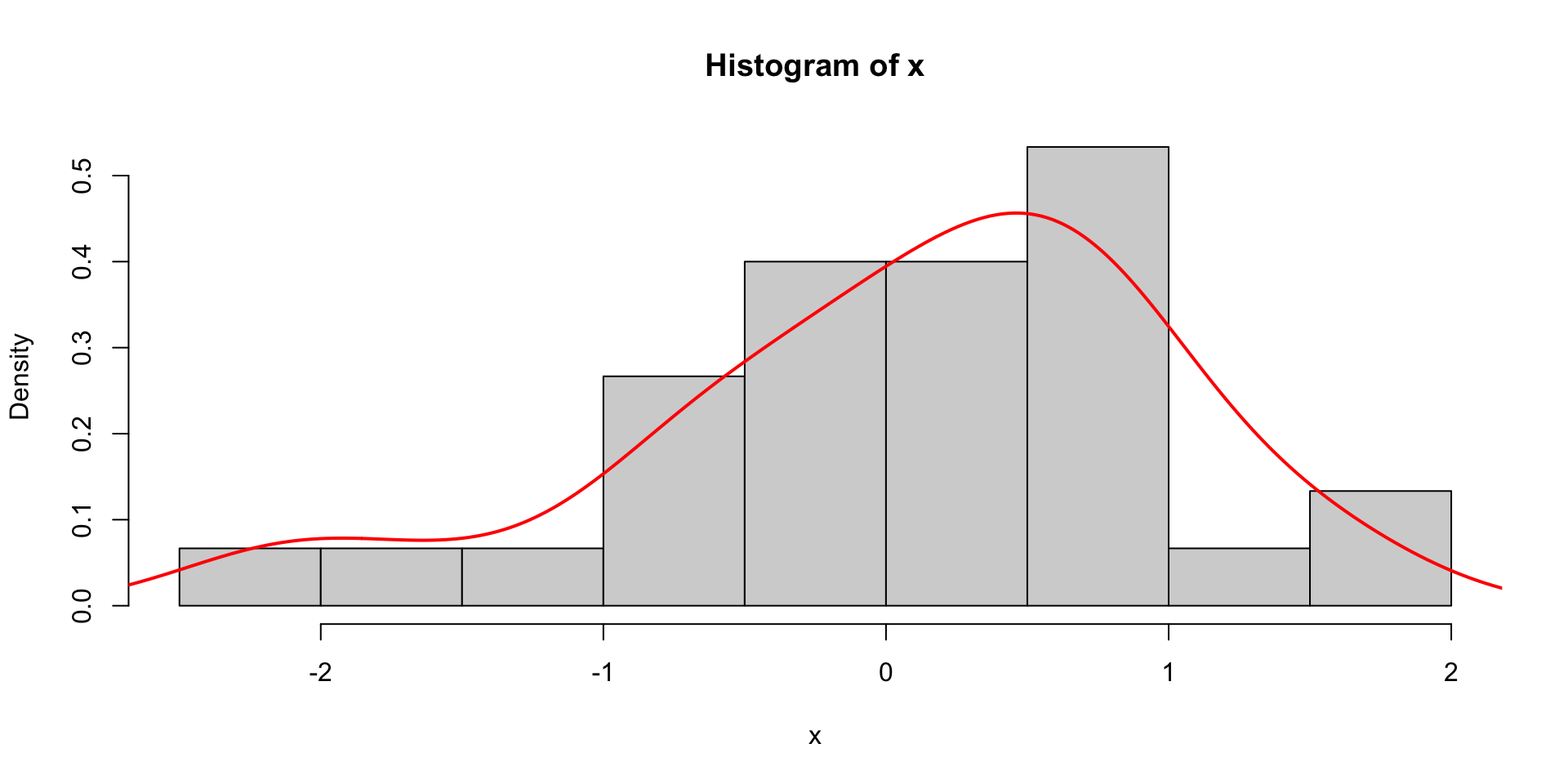 set.seed(1); x <-rnorm(30)hist(x, freq = F, breaks =10)lines(density(x), col ="red", lwd =2)