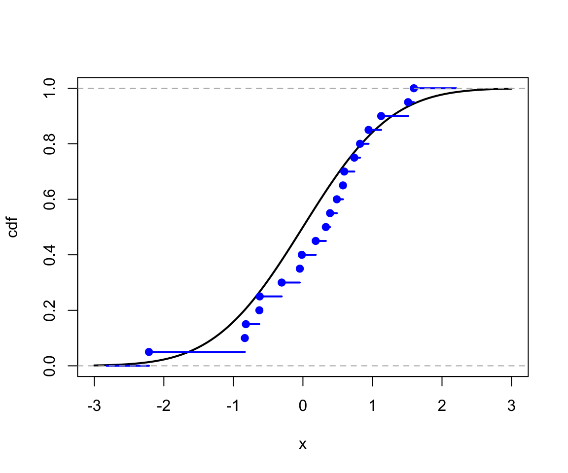 set.seed(1); x <-rnorm(20)curve(pnorm(x), -3, 3, lwd =2, ylab ="cdf")lines(ecdf(x), col ="blue", lwd =2)
